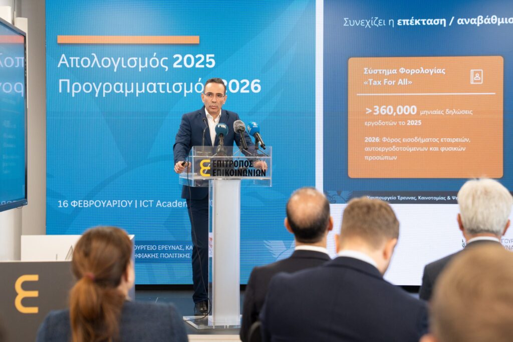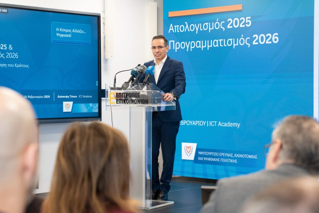 Πραγματοποιήθηκε σήμερα Δευτέρα, 16 Φεβρουαρίου 2026, συνέντευξη Τύπου του Yφυπουργού Έρευνας, Καινοτομίας και Ψηφιακής Πολιτικής δρος Νικόδημου Δαμιανού, κατά την οποία παρουσιάστηκε ο απολογισμός του έργου του Υφυπουργείου για το 2025 και ο προγραμματισμός δράσεων για το 2026. Στο επίκεντρο η επιτάχυνση της ψηφιοποίησης του κράτους και η ενίσχυση της εξυπηρέτησης πολιτών και επιχειρήσεων.